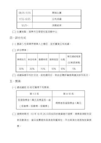 苗栗市公所將於10/5(星期六)在玉華里社區活動中心辦理113年苗栗市「暢歌」大賽, 總獎金達10萬元!! 曲目不限! 歡迎16-35歲青年組隊報名參加! 報名方式: 請至指定報名網站(網址:https://www.beclass.com/rid=294d9b566c53d40367cb )登錄報名資料 更多詳細資訊,可搜尋FB粉絲團或Google搜尋「苗栗市公所」,或洽詢專線:037-356936 陳小姐