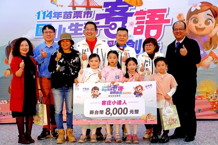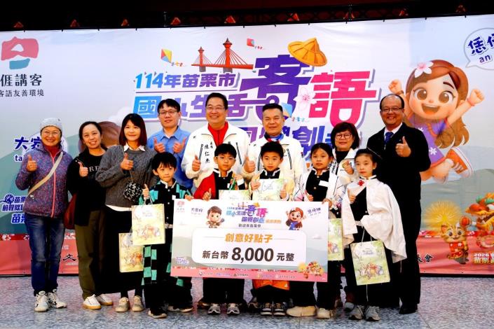 本次創意展演共集結106位學生、12支隊伍,分為1-3年級組及4-6年級組同台展演。活動由專業評審委員徐煥昇老師、蔡兆程老師,依表現內容、創意發想及整體呈現等多面向進行評選,經遴選評分出1-3年級組:苗栗好聲音獎—大同國小、動感十足獎—啟文國小、客語小金嗓獎—福星國小、閃耀之星獎—新英國小、創意好點子獎—僑育國小、客庄小達人獎—文山國小、最佳拍檔獎—文華國小;4-6年級組:好客小編劇獎—建功國小、創意好點子獎—福星國小、客庄小達人獎—啟文國小、最佳拍檔獎—僑育國小、閃耀之星獎—文山國小等表現優異之團隊,並頒發每隊8,000元獎勵金,以資鼓勵學生持續精進與創作。