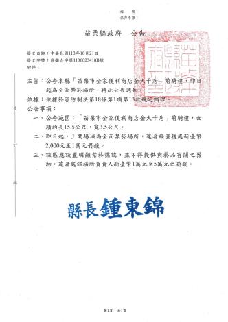 轉知 苗栗縣政府函 本縣「苗栗市全家便利商店金大千店」前騎樓,即日起為全面禁菸場所公告函1份