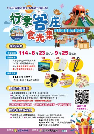 2025行尞客庄食光集摸彩活動來囉!114/8/23(六) – 9/25(四)凡於合作店家單筆消費滿 100元,即獲得摸彩券1張,單筆消費領取上限為 3 張,摸彩券數量有限,送完為止!