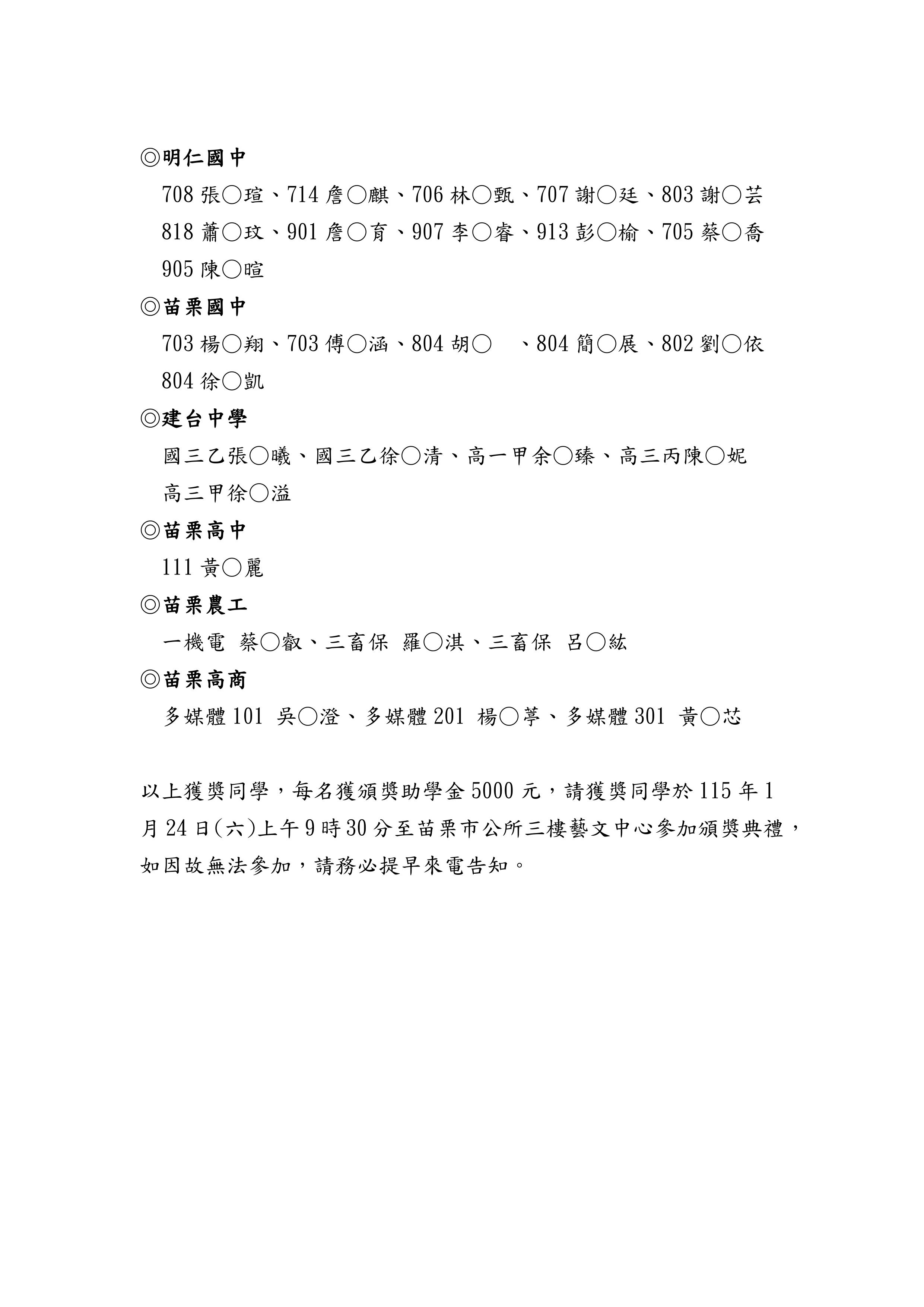 114學年度上學期苗栗市扶弱助學獎助學金獲獎名單